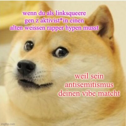 Dafür braucht es an anderer Stelle natürlich um so mehr Wortgeklingel. Am besten autoritäre Buzzwords, die keinen Raum für Austausch lassen. Ein bisschen colonize, genocide, intifada, white supremacy und ähnlich freshe Begriffe, die einem schon mal auf TikTok entgegengebrüllt wurden. Entscheidend für den Social-Media-Rap-Warrior der Jetztzeit: Die Texte von frühen Slime-Platten sollten dagegen klingen wie ein sehr differenziertes Referat. Ist das nicht der Fall, hast du vermutlich noch zu viel Reflexion drin. Das sähe unser Krafttier Macklemore sicher nicht gern!
