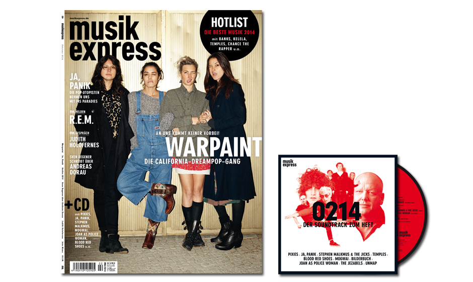 Auf insgesamt 114 Seiten findet Ihr in der neuen Februar-Ausgabe des Musikexpress neben den zwei Titelgeschichten über einerseits Warpaint, die „California-Dreampop-Gang“, und andererseits Ja, Panik, die „Pop-Utopisten“, unter anderem unsere Hotlist mit der besten Musik 2014, ein ME.GESPRÄCH mit Judith Holofernes und eine ausführliche ME.HELDEN-Geschichte über R.E.M.. Sven Regener schreibt für uns über Andreas Dorau, wir selber haben mit John Niven über sein neues Buch „Straight White Male“ gesprochen. Oh, und eine CD mit Künstlern wie Pixies, Ja, Panik, Stephen Malkmus, Mogwai, Joan As Police Woman und Blood Red Shoes haben wir Euch auch ins Heft gelegt.