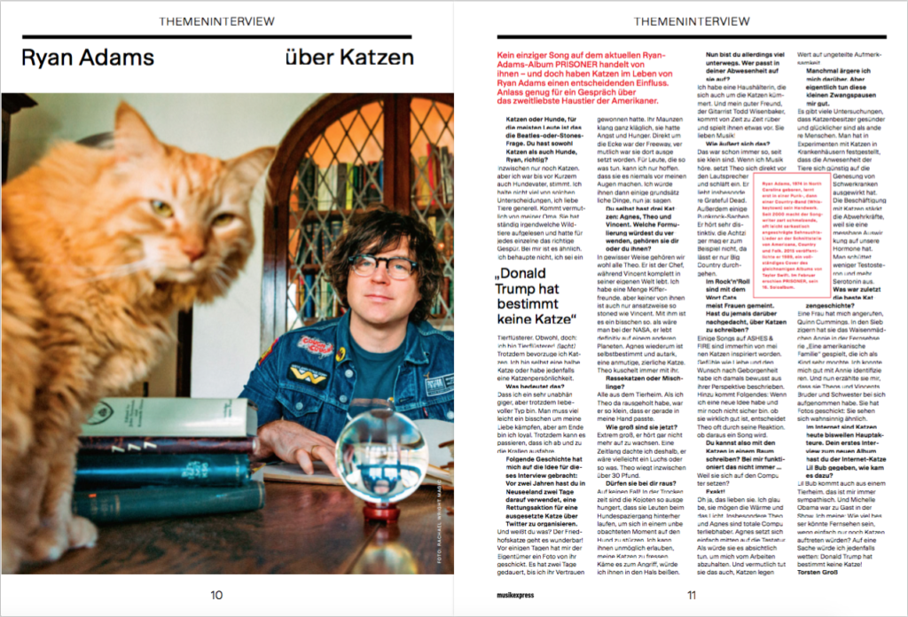 Kein einziger Song auf dem aktuellen Ryan-Adams-Album PRISONER handelt von ihnen – und doch haben Katzen im Leben von Ryan Adams einen entscheidenden Einfluss. Anlass genug für ein Gespräch über das zweitliebste Haustier der Amerikaner.