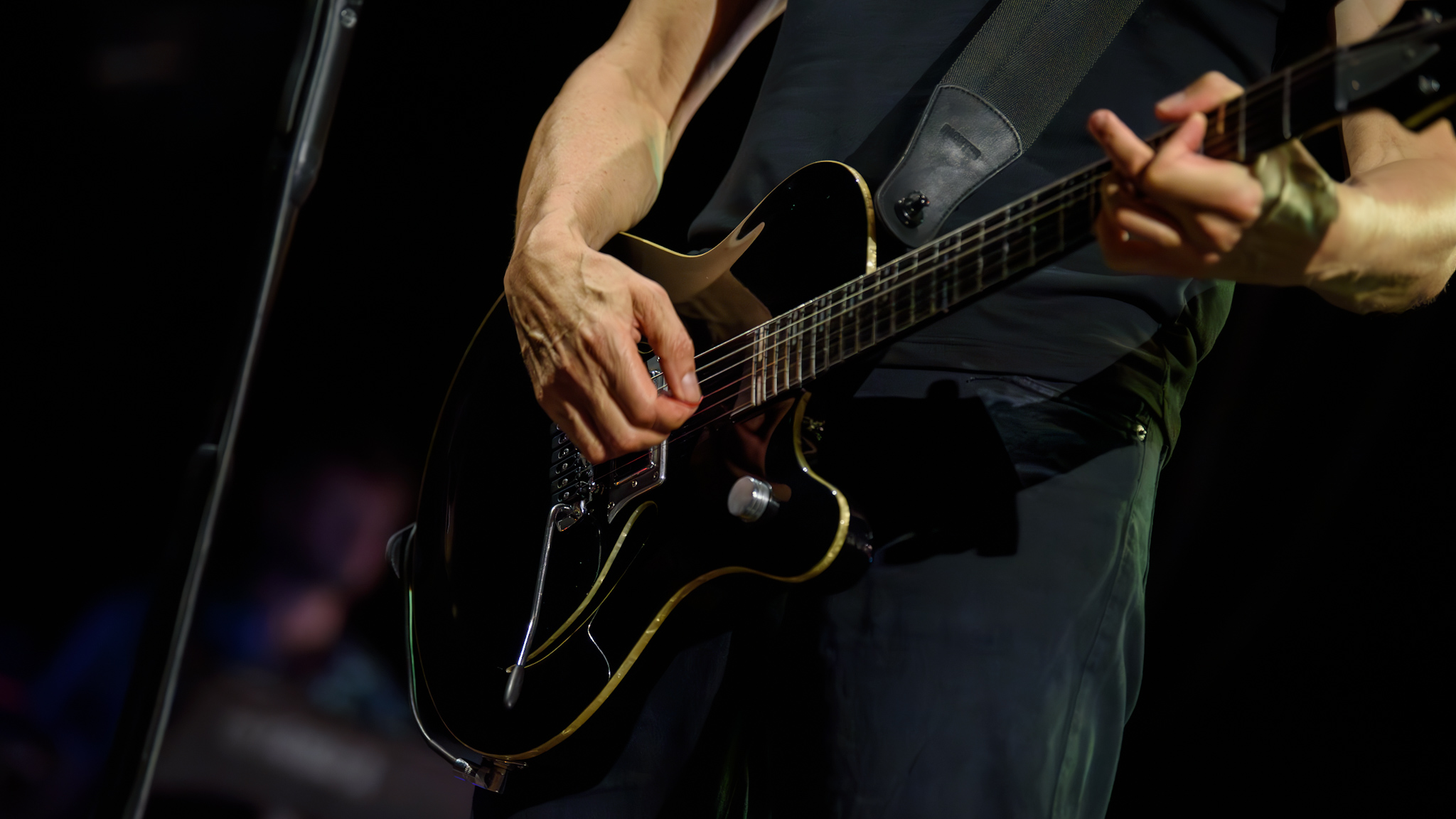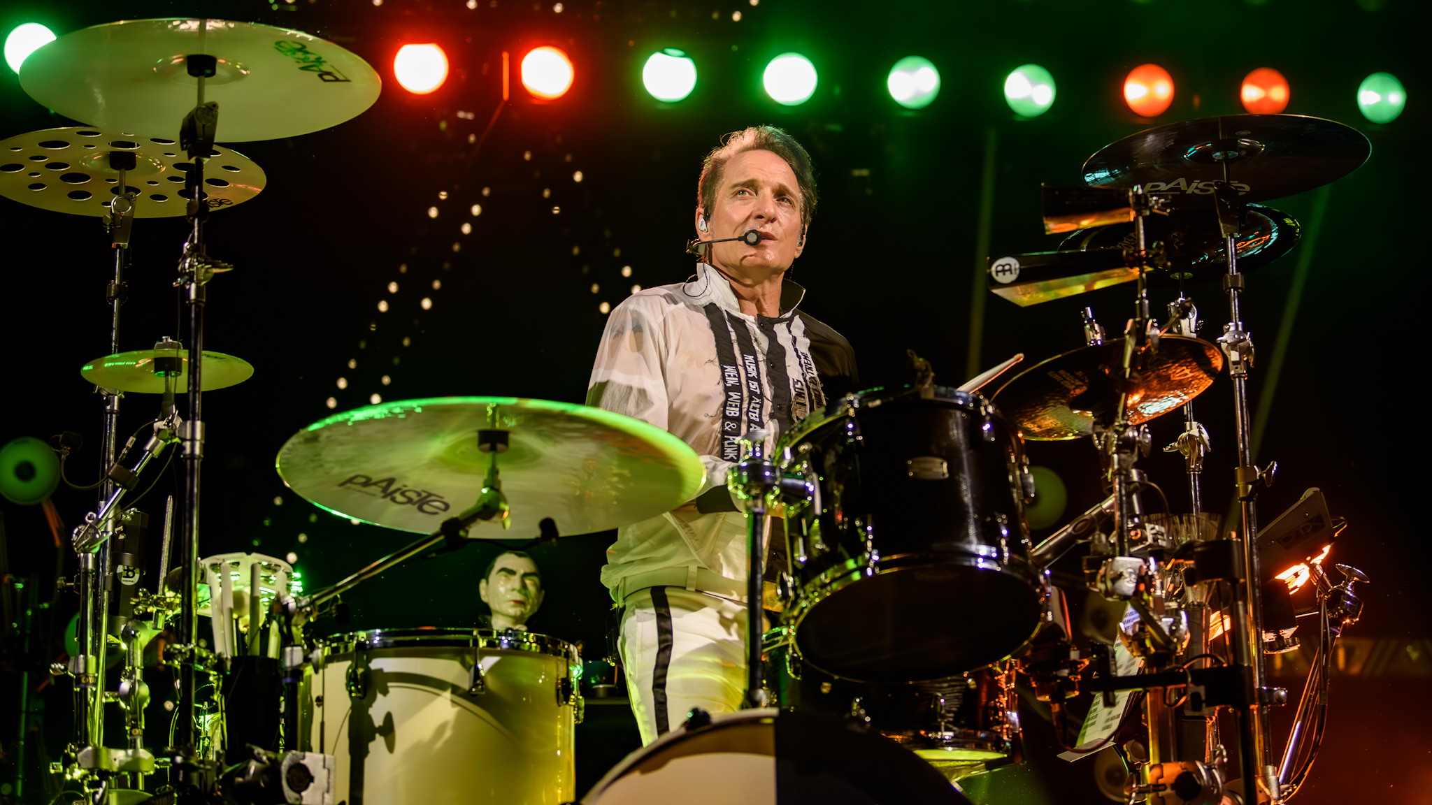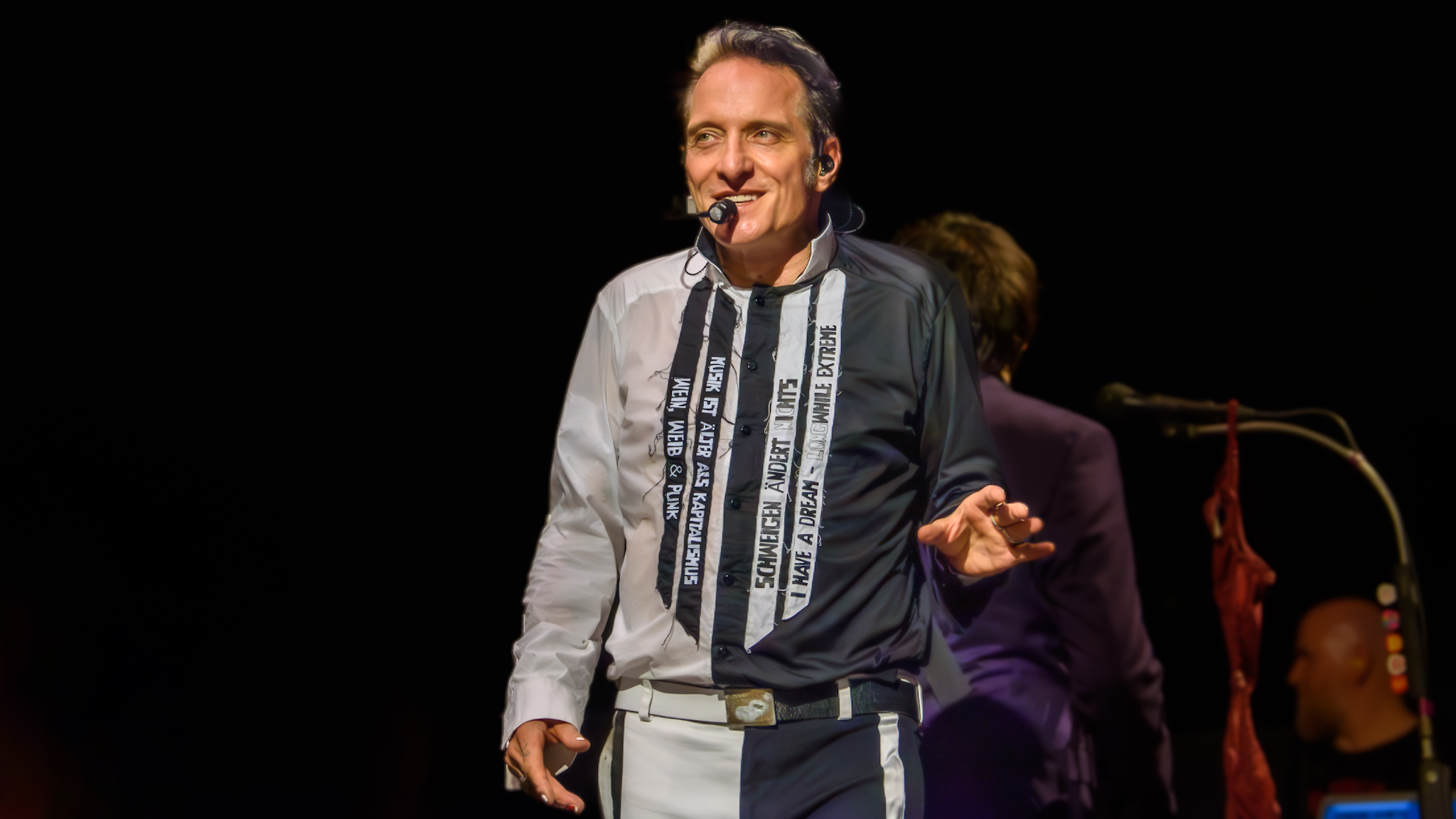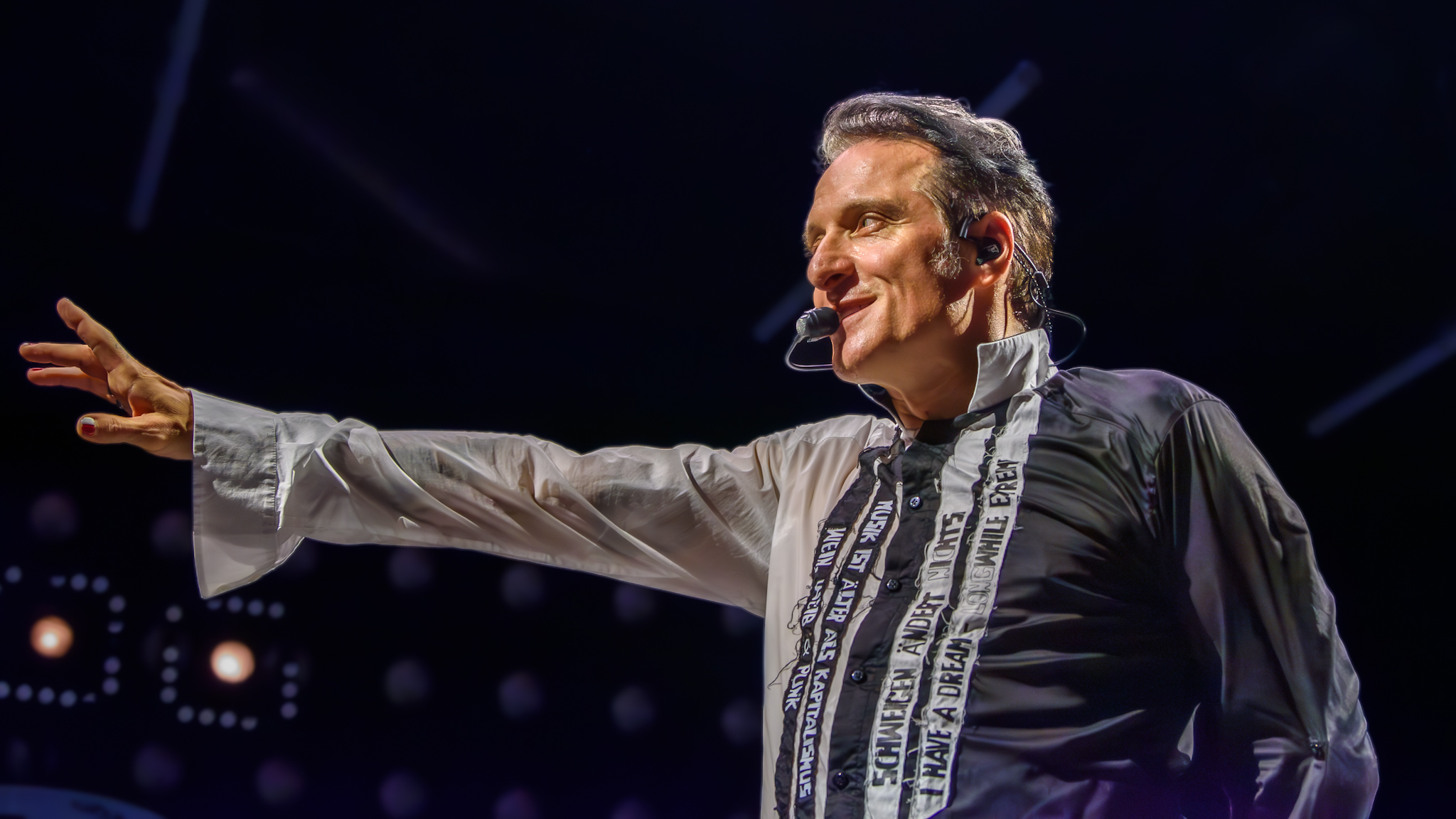 Pünktlich um 20 Uhr fällt der Vorhang – oder doch nicht? Das schwere Stück Stoff will den Blick auf die Stars nicht freigeben und gemäß dem Motto „Auffallen durch Nichtfallen“ muss manuell mit einem beherzten Ruck nachgeholfen werden. Aber dann erscheint der einzig wahre Gott – BelaFarinRod. Rodrigo González wie immer im feinen Zwirn, Farin Urlaub leger mit schwarzer Jeans und ebenso farbenfrohem Shirt und Bela B in einem schwarz-weißen Anzug mit aufgenähten Botschaften. Jeder der Musiker wird zu Beginn von nur einer Bürolampe von oben angestrahlt, bevor das Bühnenlicht wechselt und der Lichtmann ein wahres Feuerwerk – immer passend zur Stimmung – entfacht.