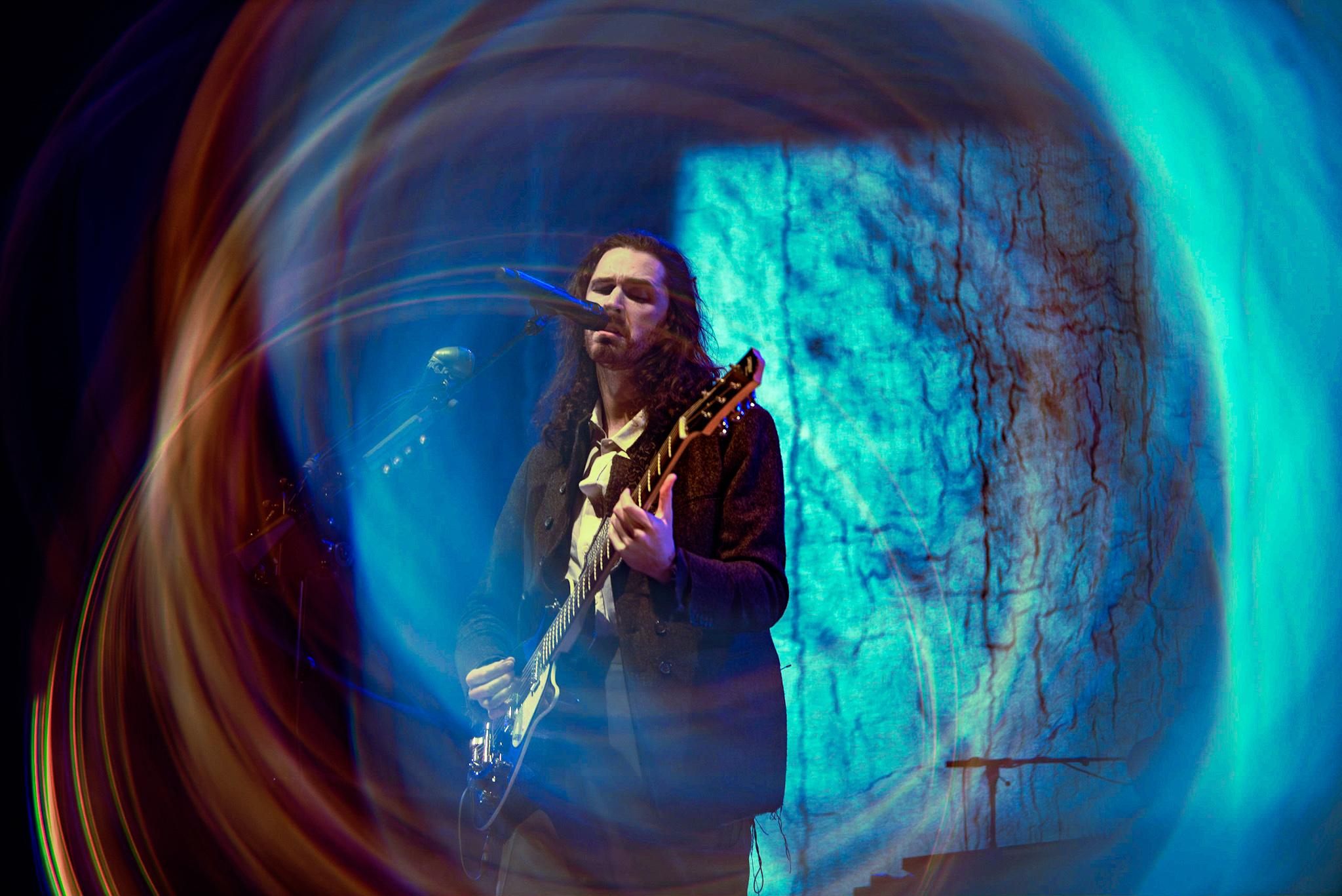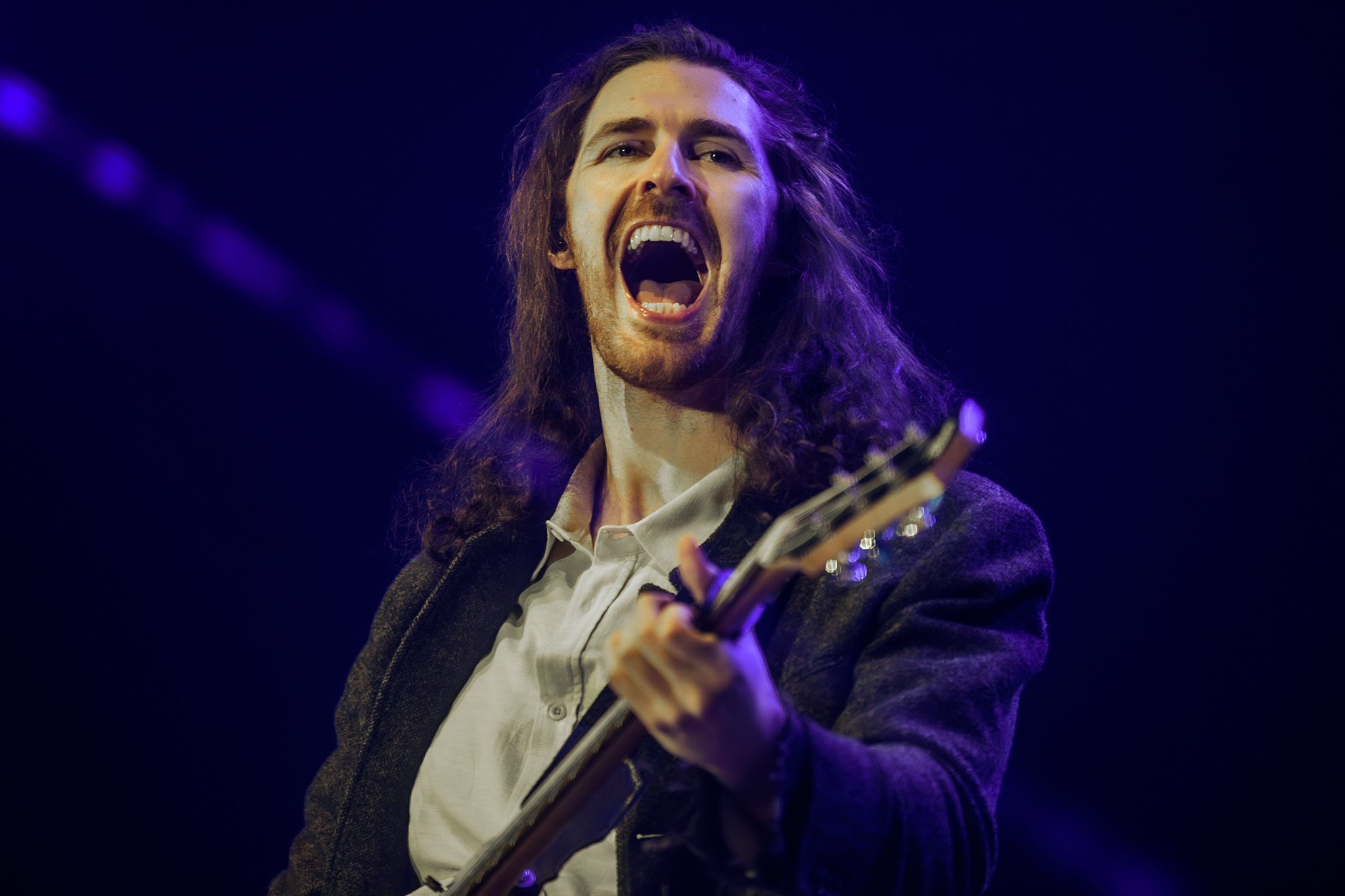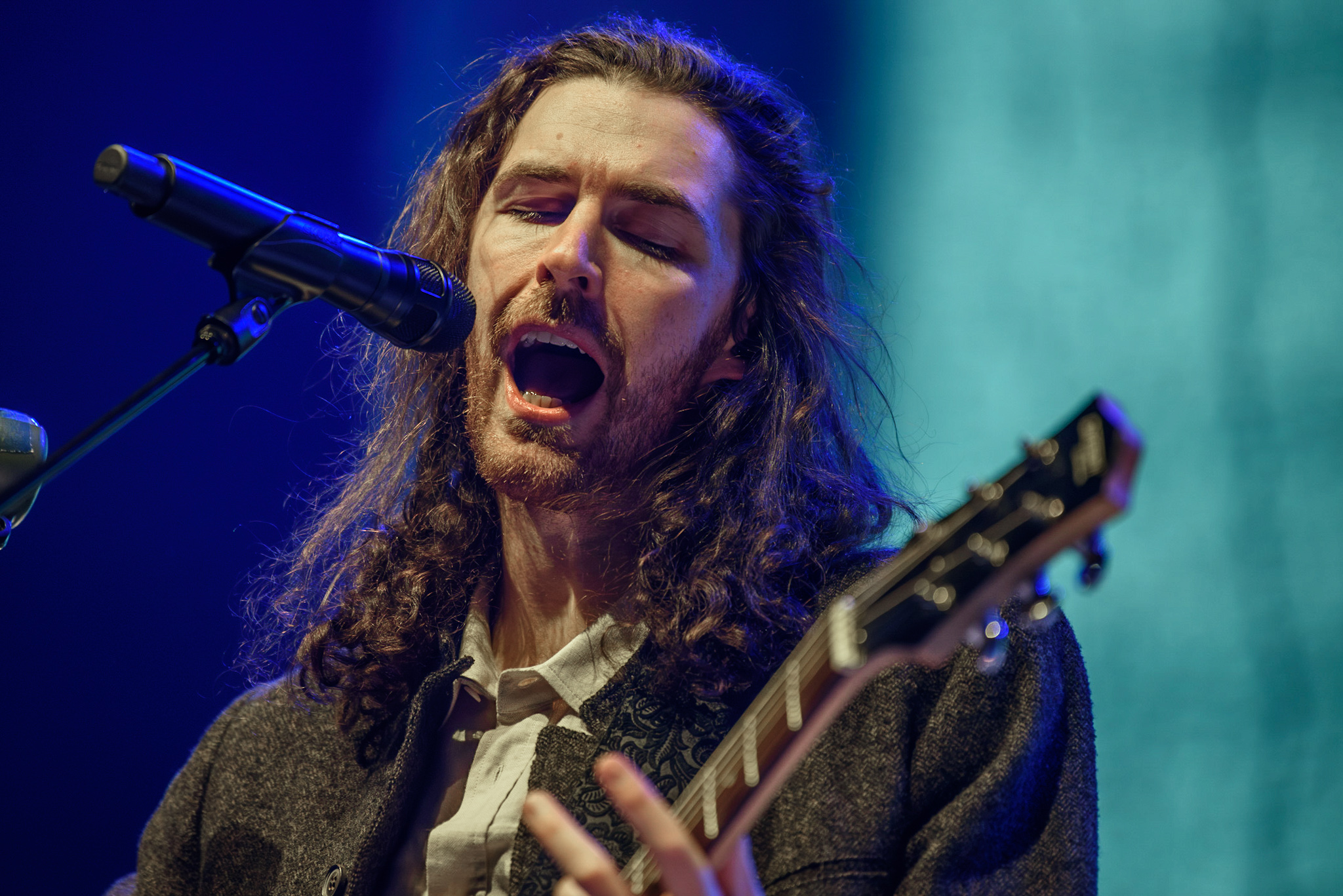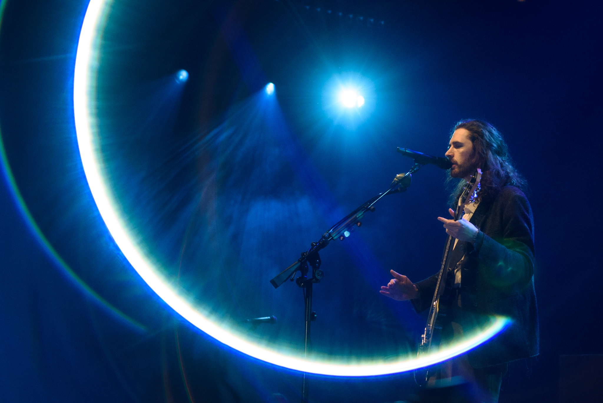 Das Licht im Saal erlischt und nur ein einzelner, irisierender Spot verharrt auf der ansonsten blau eingefärbten Bühne. Unter tosendem Applaus betreten Hozier und seine, noch im Dunkeln versteckte, achtköpfige Entourage aus Musiker:innen die Bühne. Hozier beginnt das Konzert unaufgeregt mit den ersten beiden Titeln der aktuellen Platte, „De Selby (Part 1 and 2)“ und zeigt hier direkt sein grandioses Talent für die ruhigen Töne, die er wie kein zweiter in der Indie-Folk-Szene beherrscht. Augenblicklich weicht das aufgeregte Getuschel im Publikum andächtiger Stille und gebannt hängt das Publikum an den Lippen des 33-Jährigen. Bescheiden, fast schon verletzlich steht er am Mikrofon, gekleidet in einen grauen Dreiteiler, den er ebenso gut aus der Mottenkiste seines Großvaters hervorgezogen haben könnte. Seine langen, braunen Locken wackeln im Takt, wenn er voller Hingabe in die Saiten seiner Gitarre schlägt und, versunken in seine Musik, mit geschlossenen Augen skandiert. „If I was any closer // I would only lose me // If I fade away, let me fade away“.