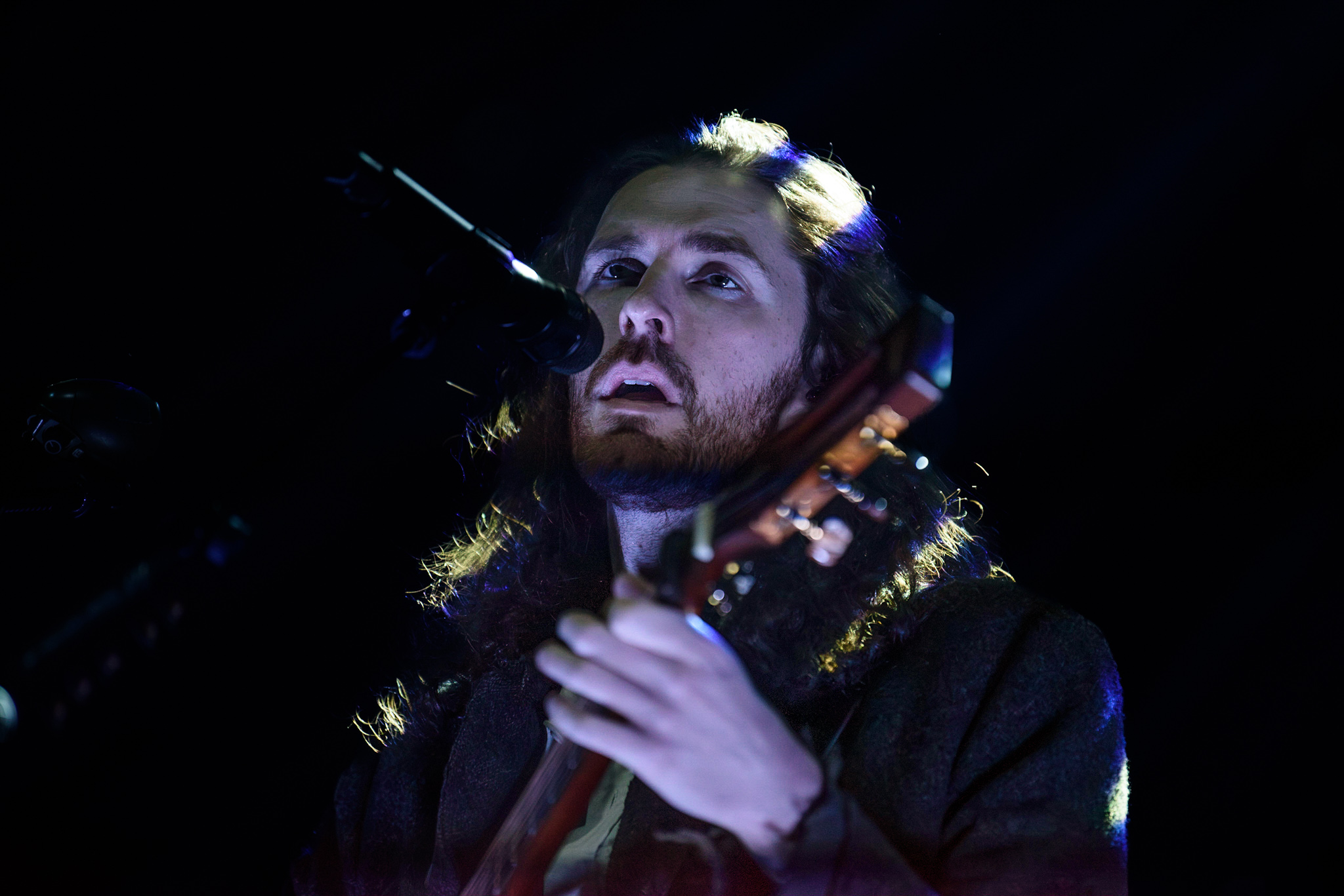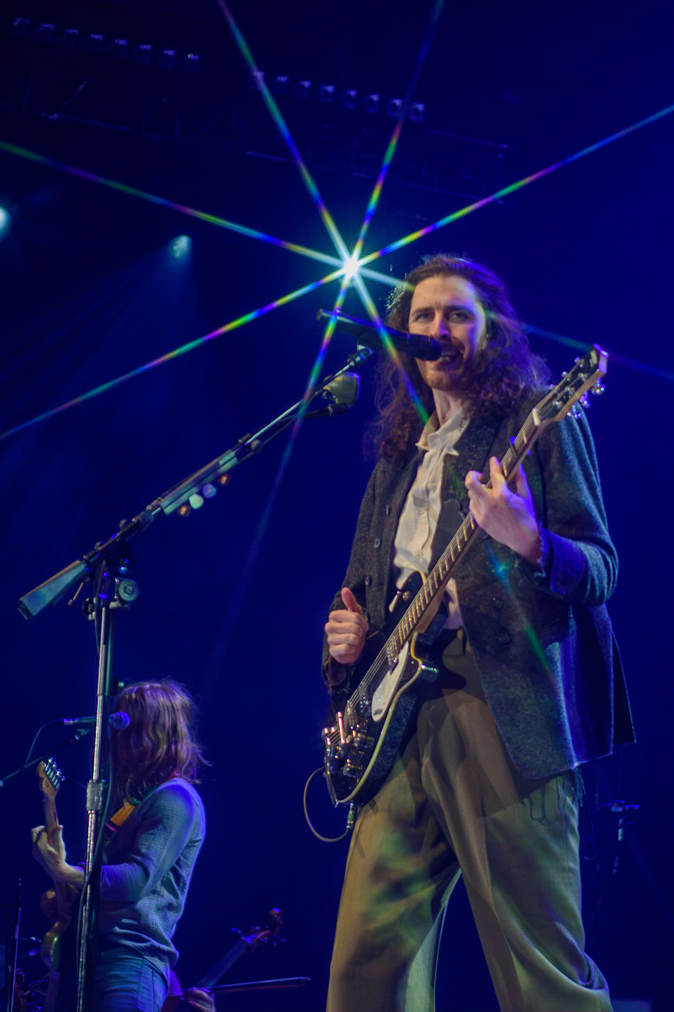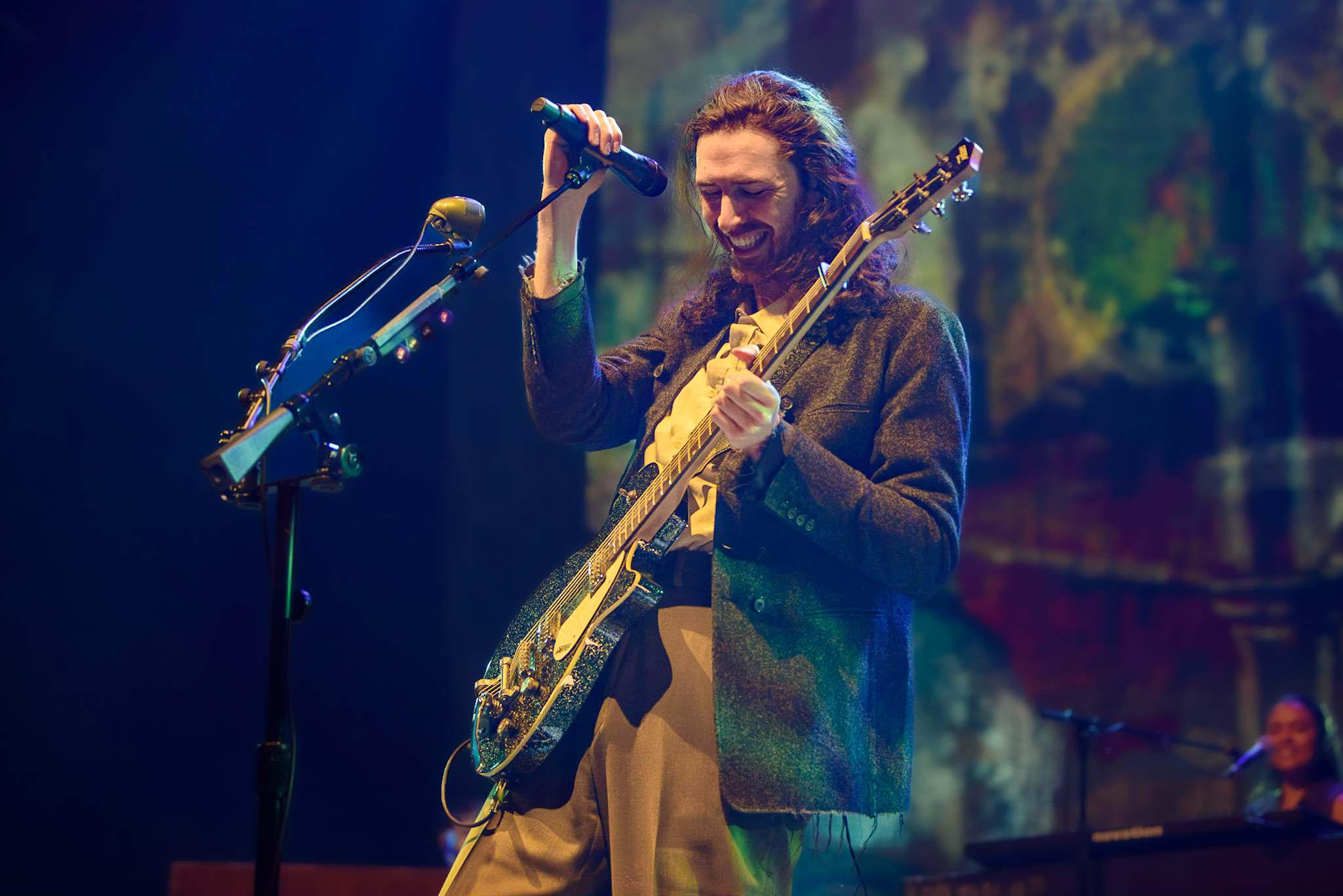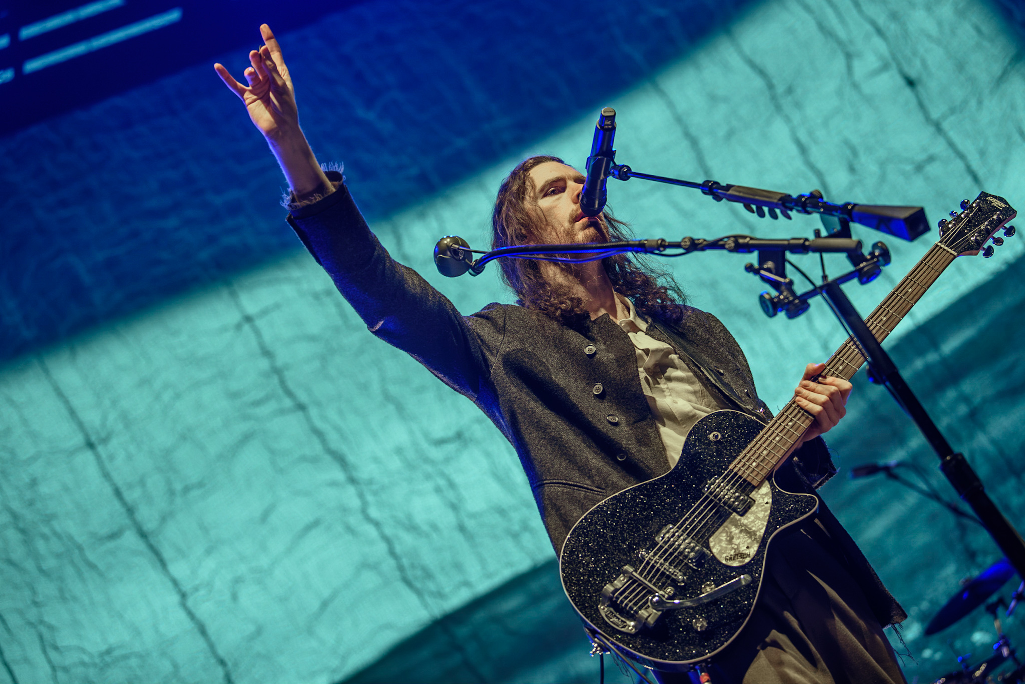 Das Licht im Saal erlischt und nur ein einzelner, irisierender Spot verharrt auf der ansonsten blau eingefärbten Bühne. Unter tosendem Applaus betreten Hozier und seine, noch im Dunkeln versteckte, achtköpfige Entourage aus Musiker:innen die Bühne. Hozier beginnt das Konzert unaufgeregt mit den ersten beiden Titeln der aktuellen Platte, „De Selby (Part 1 and 2)“ und zeigt hier direkt sein grandioses Talent für die ruhigen Töne, die er wie kein zweiter in der Indie-Folk-Szene beherrscht. Augenblicklich weicht das aufgeregte Getuschel im Publikum andächtiger Stille und gebannt hängt das Publikum an den Lippen des 33-Jährigen. Bescheiden, fast schon verletzlich steht er am Mikrofon, gekleidet in einen grauen Dreiteiler, den er ebenso gut aus der Mottenkiste seines Großvaters hervorgezogen haben könnte. Seine langen, braunen Locken wackeln im Takt, wenn er voller Hingabe in die Saiten seiner Gitarre schlägt und, versunken in seine Musik, mit geschlossenen Augen skandiert. „If I was any closer // I would only lose me // If I fade away, let me fade away“.