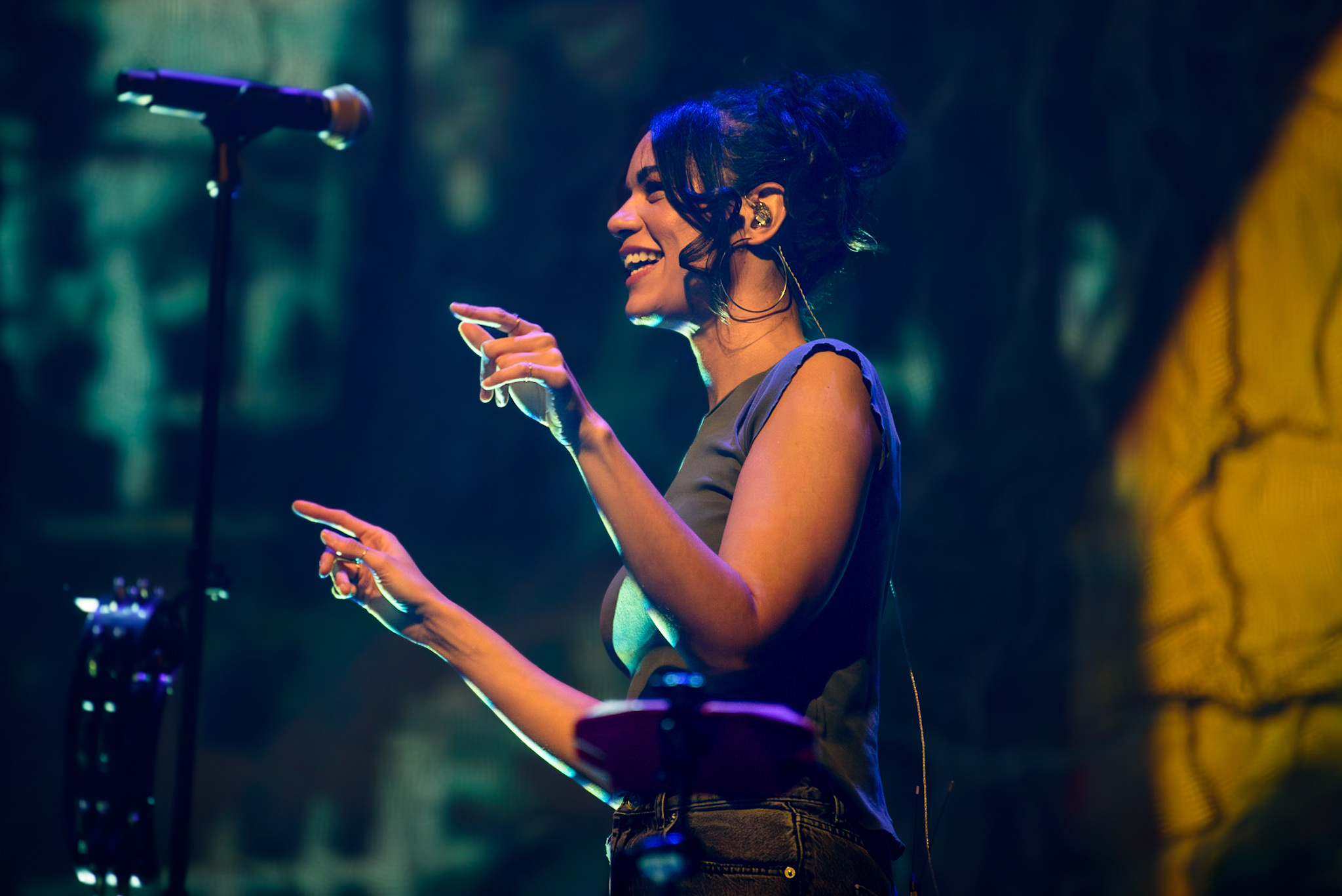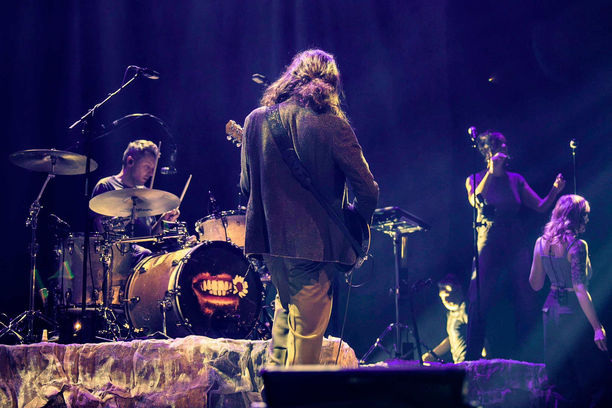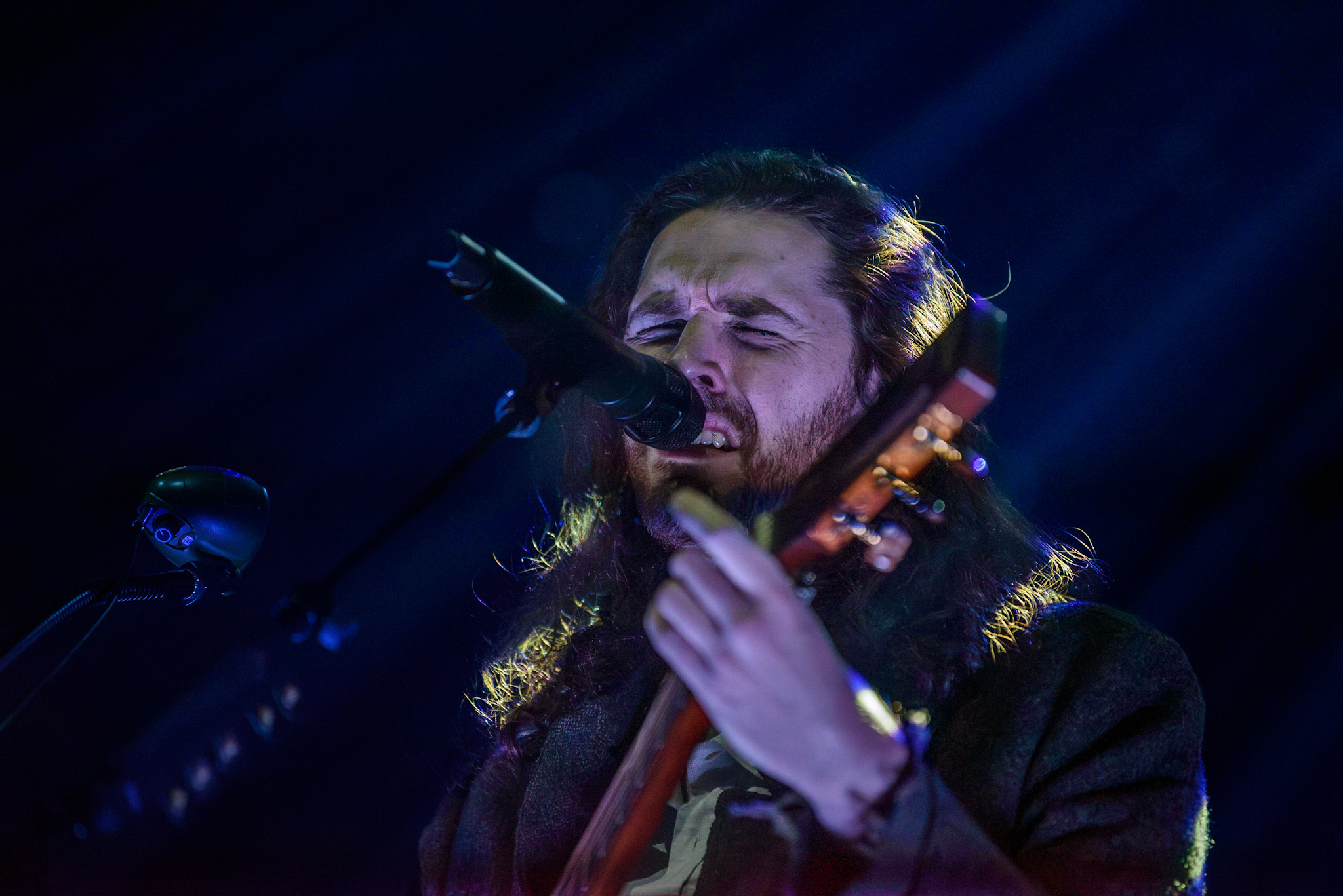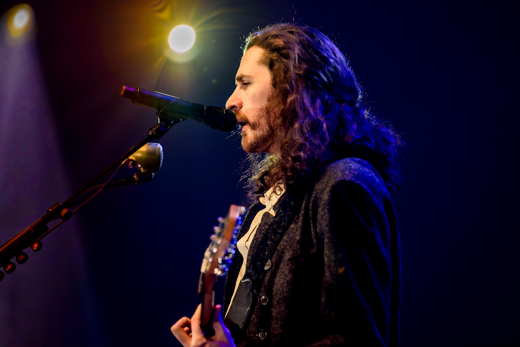Das Licht im Saal erlischt und nur ein einzelner, irisierender Spot verharrt auf der ansonsten blau eingefärbten Bühne. Unter tosendem Applaus betreten Hozier und seine, noch im Dunkeln versteckte, achtköpfige Entourage aus Musiker:innen die Bühne. Hozier beginnt das Konzert unaufgeregt mit den ersten beiden Titeln der aktuellen Platte, „De Selby (Part 1 and 2)“ und zeigt hier direkt sein grandioses Talent für die ruhigen Töne, die er wie kein zweiter in der Indie-Folk-Szene beherrscht. Augenblicklich weicht das aufgeregte Getuschel im Publikum andächtiger Stille und gebannt hängt das Publikum an den Lippen des 33-Jährigen. Bescheiden, fast schon verletzlich steht er am Mikrofon, gekleidet in einen grauen Dreiteiler, den er ebenso gut aus der Mottenkiste seines Großvaters hervorgezogen haben könnte. Seine langen, braunen Locken wackeln im Takt, wenn er voller Hingabe in die Saiten seiner Gitarre schlägt und, versunken in seine Musik, mit geschlossenen Augen skandiert. „If I was any closer // I would only lose me // If I fade away, let me fade away“.