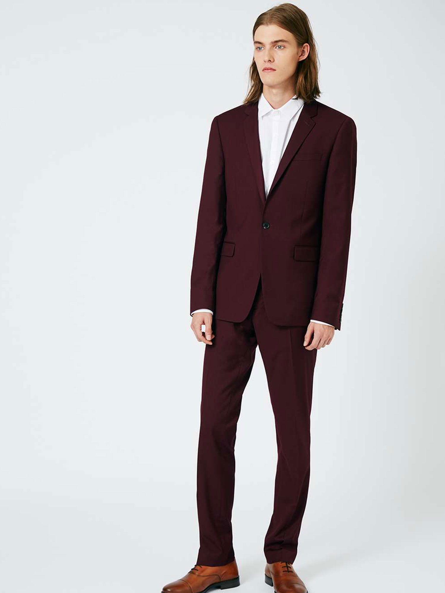 Männermoden-Trend: Weiße Sneakers zum bordeauxroten Anzug