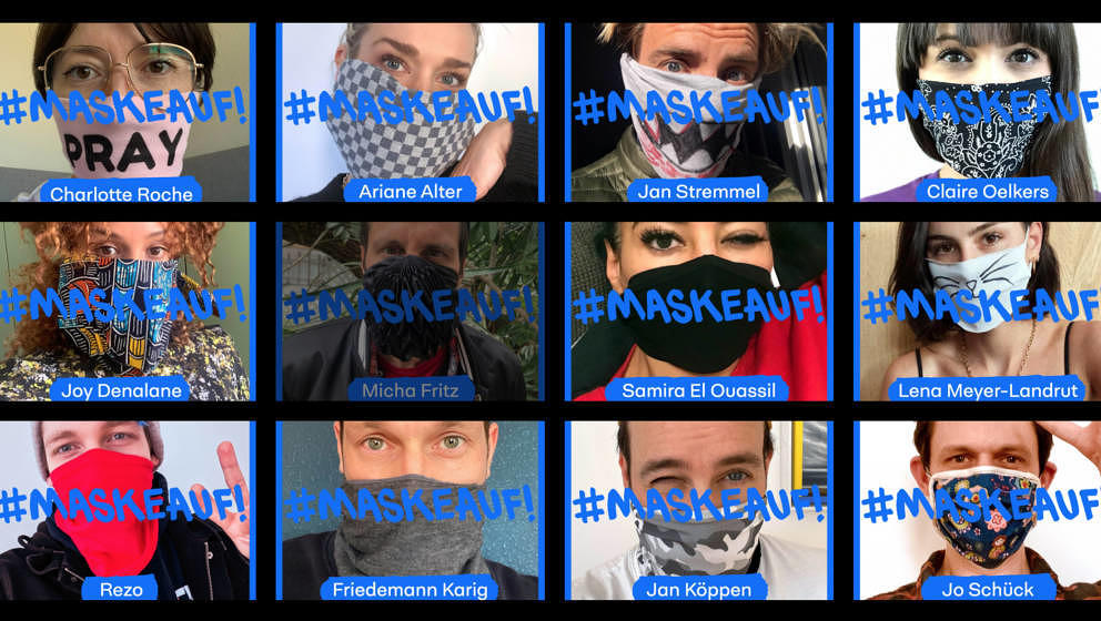 Ein Team aus Redakteur*innen und anderen Kreativen hat sich in Deutschland während der Corona-Krise zusammengetan, um mit der Initiative #maskeauf darauf aufmerksam zu machen, wie wichtig das Tragen eines Mundschutzes ist, um die Verbreitung von Viren einzudämmen. Die Promis Charlotte Roche, Ariane Alter, Jan Stremmel, Claire Oelkers, Joy Denalane, Micha Fritz, Samira El Quassil, Lena Meyer-Landrut, Rezo, Friedemann Karig, Jan Köppen und Jo Schück werben dabei mit ihrem Gesicht – plus Atemschutzmaske, klar.