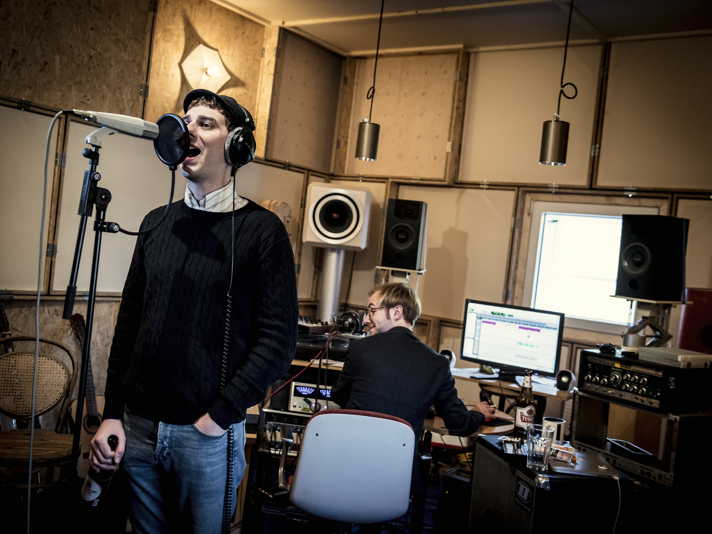 Der Assistent des Fotografen hat noch einen Anschlusstermin. Pendler-Stau raus aus Berlin war auch. Deshalb haben wir jetzt Zeitdruck. Und so stecken wir in der absurden Situation, dass die Band tatsächlich noch etwas aufnehmen möchte mit uns als Zeugen, wir dabei sogar mitten im Studio hocken bleiben können, es gibt sonst auch kaum Platz. Ein paar Overdubs sind nämlich noch notwendig für ihr durchweg live eingespieltes Album. Sänger Tobias Bamborschke muss auch noch was einsingen. Doch dem Fotografen wäre es fast lieber, sie würden nur so tun. Ginge schneller …