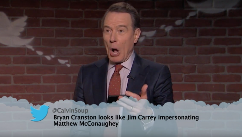 In der aktuellen Runde mussten Margot Robbie, Ryan Gosling, Hugh Grant, Norman Reedus, Olivia Wilde und Bryan Cranston sich der Wut der Internet-Nutzer stellen. Während Olivia Wilde nur ihre Augen verdrehen kann über eine Anmerkung über ihre angeblich großflächige Stirn und Kiefer Sutherland kein Verständnis für blöde Witzchen zeigt, trifft es vor allem den „Breaking Bad“-Darsteller besonders hart: „Bryan Cranston sieht aus wie Jim Carrey, der versucht Matthew McConaughey zu imitieren“, heißt es in einem Tweet. Cranston reagiert darauf, selbstverständlich, mit einer kleinen Einlage à la Carrey/McConaughey.
