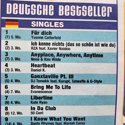 Stimmt, Musik gibt’s ja auch noch – und die hat es in dieser ausgewählten Woche ganz schön in sich. Zu jener Zeit erschien das Jugendmagazin noch wöchentlich, heute ist man bei einer monatlichen Distribution angelangt. In diesem Frühjahr 2003 winkt von oben Yvonne Catterfeld. Das mag einen ästhetisch vielleicht nicht ganz so abholen, aber immer noch besser als die dahinter lauernden Spukgestalten mit Querdenker-Swag, Nena und Xavier. Auf Platz vier wiederum der mittlerweile tragisch zu Tode gekommene Daniel Küblböck und dahinter noch DJ Tomekk, der fünf Jahre später wegen eines Hitlergrußes unehrenhaft aus dem Dschungelcamp fliegen wird. Grundgütiger! 2003, das waren also deine Charts?