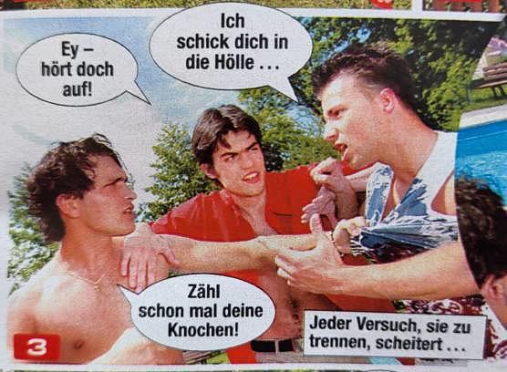 In der Geschichte „Kathis gefährliches Liebesspiel“ geht es angenehm hemdsärmelig zur Sache. Piff, paff, puff! Die Geschlechter sind dabei noch streng getrennt und gut unterscheidbar: So kämpfen die Boys im Freibad um die Frauen („Zähl schon mal deine Knochen!“). Während die Girls sich wiederum mit dem Zwischenmenschlichen beschäftigen („Immer wenn er ’ne Tüte drüberzieht, schlafft er ab.“). Den Bechdel-Test besteht diese Fotolovestory vielleicht nicht, aber sie legt dennoch ein buntes Zeugnis davon ab, wie unentbehrlich diese Rubrik für den Guilty-Pleasure-Lesegenuss einer BRAVO ist.