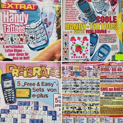 Das zentrale und alles beherrschende Thema einer Jugend 2003 lautet völlig unmissverständlich: Handy! Alles in dieser Zeitschrift schreit Handy, Handy, Handy: Handy-Tattoos! Handy-Verlosung! MMS-Foto der Woche! Die besten SMS-Sprüche! Und natürlich vor allem: Klingeltonwerbung! Ein Angebot, das schon allein von der graphischen Darreichung her Menschen ab einem gewissen Alter ausschließt, denn wer außer einem Heranwachsenden mit fester Augenmuskulatur soll denn diese 4-Punkt-Schrift all jener ganzseitigen aufgeregten Anzeigen zum Thema überhaupt lesen können?