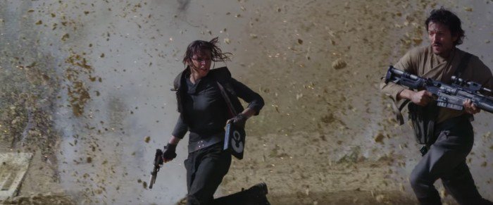 In einer beeindruckenden Szene aus dem Trailer fliehen Jyn Erso und Cassian Andor hinaus in die tobende Schlacht auf dem „Strandplaneten“. In der Hand hält Jyn Erso (Felicity Jones) dabei deutlich erkennbar die Pläne des Todessterns. In der finalen Fassung des Films haben diese die Basis jedoch niemals verlassen. Achtet bei dem folgenden Ausschnitt auf die linke Hand der Heldin, in der sie die Baupläne hält: