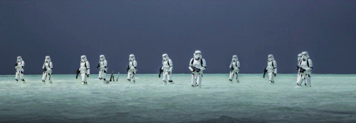 Als im Sommer bekannt wurde, dass Regisseur Gareth Edwards von Studioverantwortlichen zu Nachdrehs gezwungen wurde, versuchten Disney und Lucasfilm die Wogen zu glätten. Es seien nur kleine Änderungen vorgenommen worden, die zusätzlichen Drehtage seien nicht weit entfernt von der Routine vieler Blockbuster. Nach der Sichtung von „Rogue One“ kann man diese Aussagen allerdings kaum glauben. Zu drastisch und aufwendig scheinen Änderungen im Schnitt und einzelnen Szenen. So ist zum Beispiel einer der bekanntesten Shots aus der Marketing-Kampagne nicht mehr im Film zu sehen: