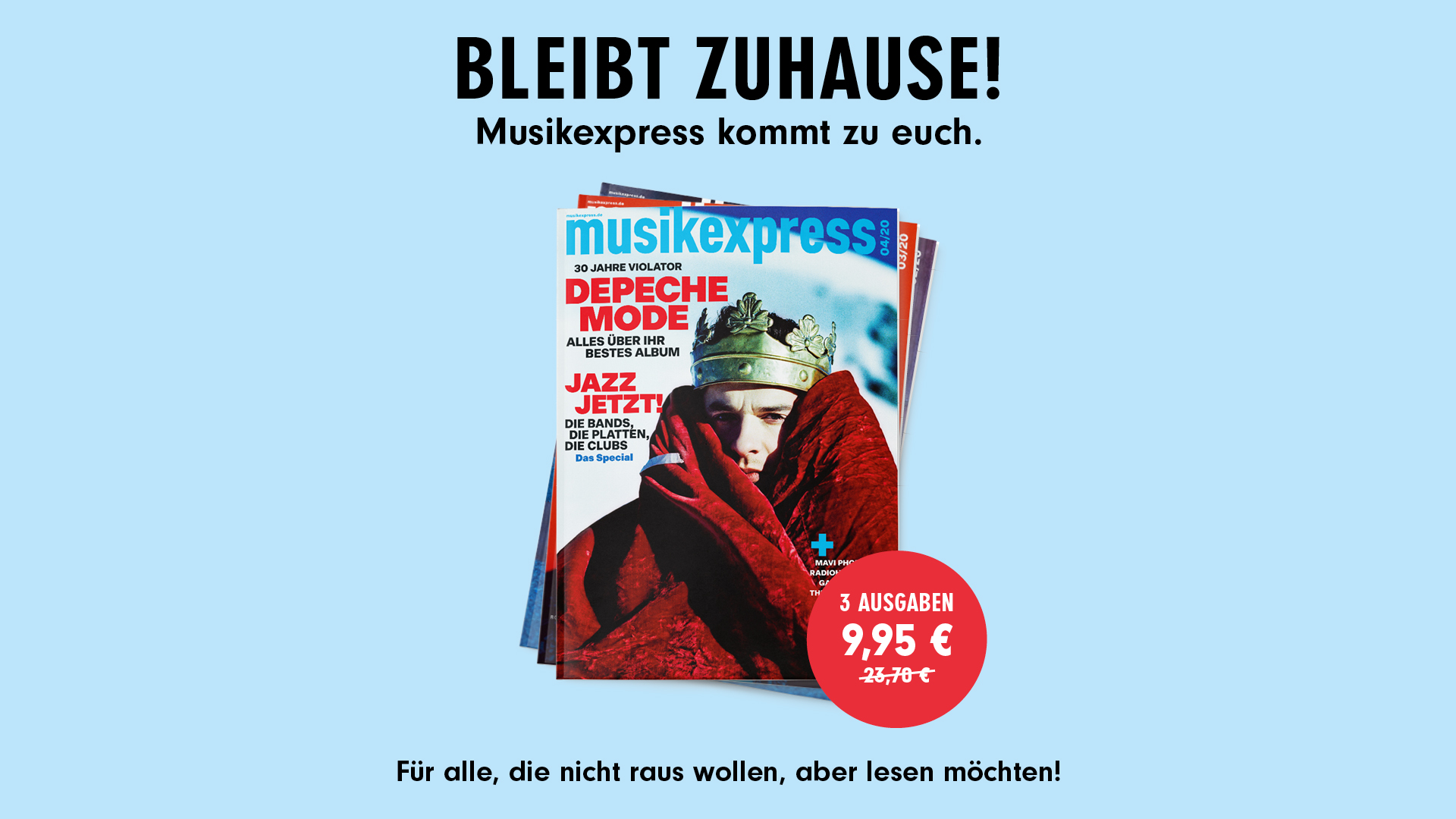 Geht nicht zum Kiosk oder gar zum Bahnhofshandel, bleibt wie wir zuhause! Nutzt von dort aus einfach unser Spezial-Abo: Der Musikexpress kommt zu Euch, und das als unschlagbares Angebot: 3 Ausgaben für 9,95 Euro statt 23,70 Euro. Für alle, die nicht raus wollen, aber lesen möchten.