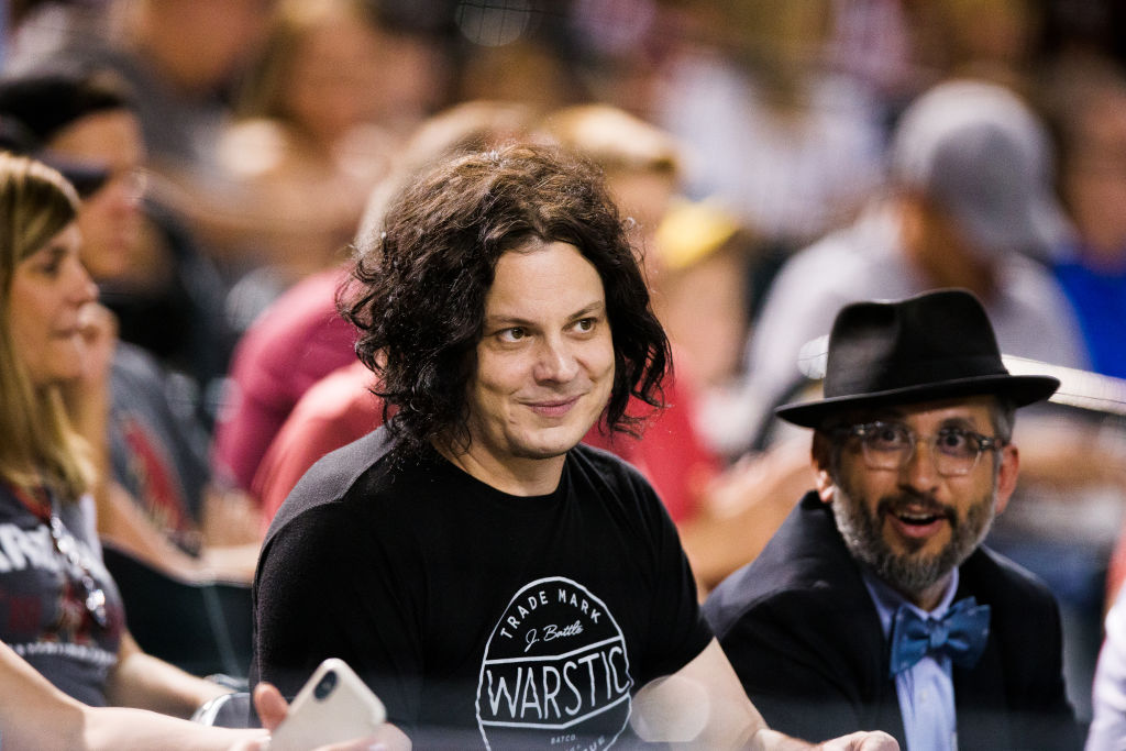 PHOENIX, AZ - AUGUST 22: Jack White from The White Stripes watches an MLB game between the Arizona Diamondbacks and Los An...