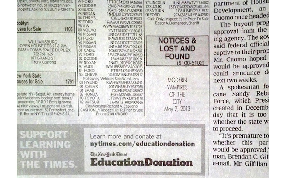 Geheimnisvolle Nachrichten im Kleingedruckten: Vampire Weekend schalten eine unkommentierte Kleinanzeige in der New York Times mit dem Titel ihres neuen Albums "Modern Vampires Of The City".