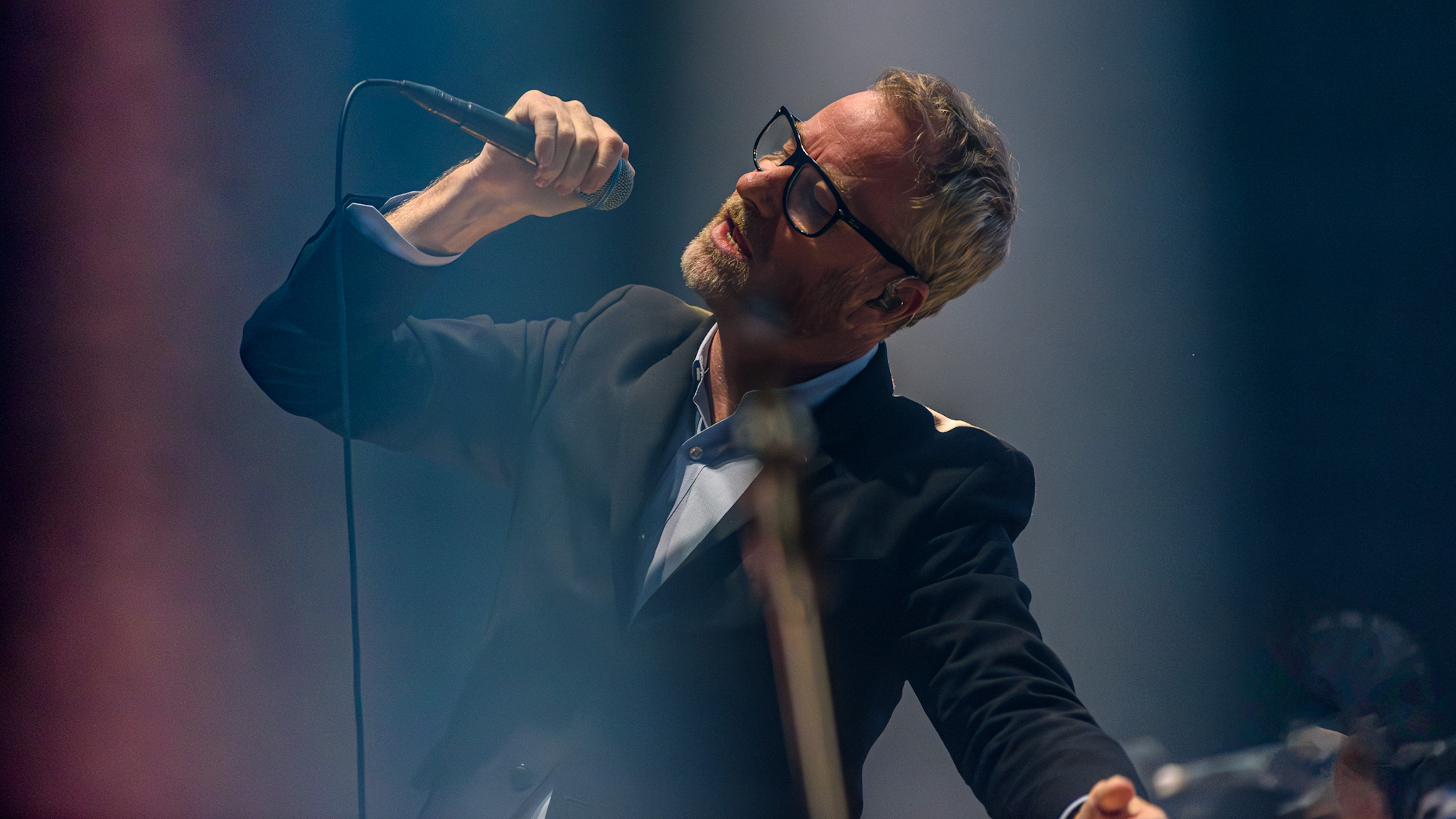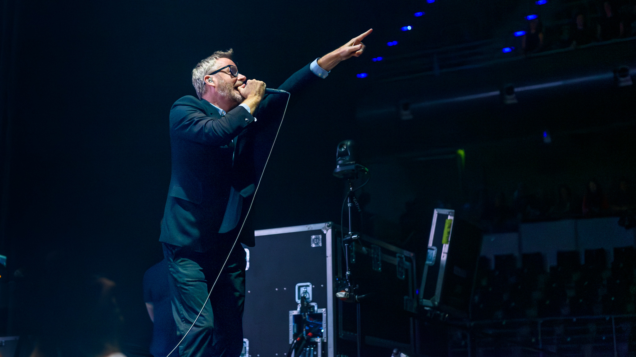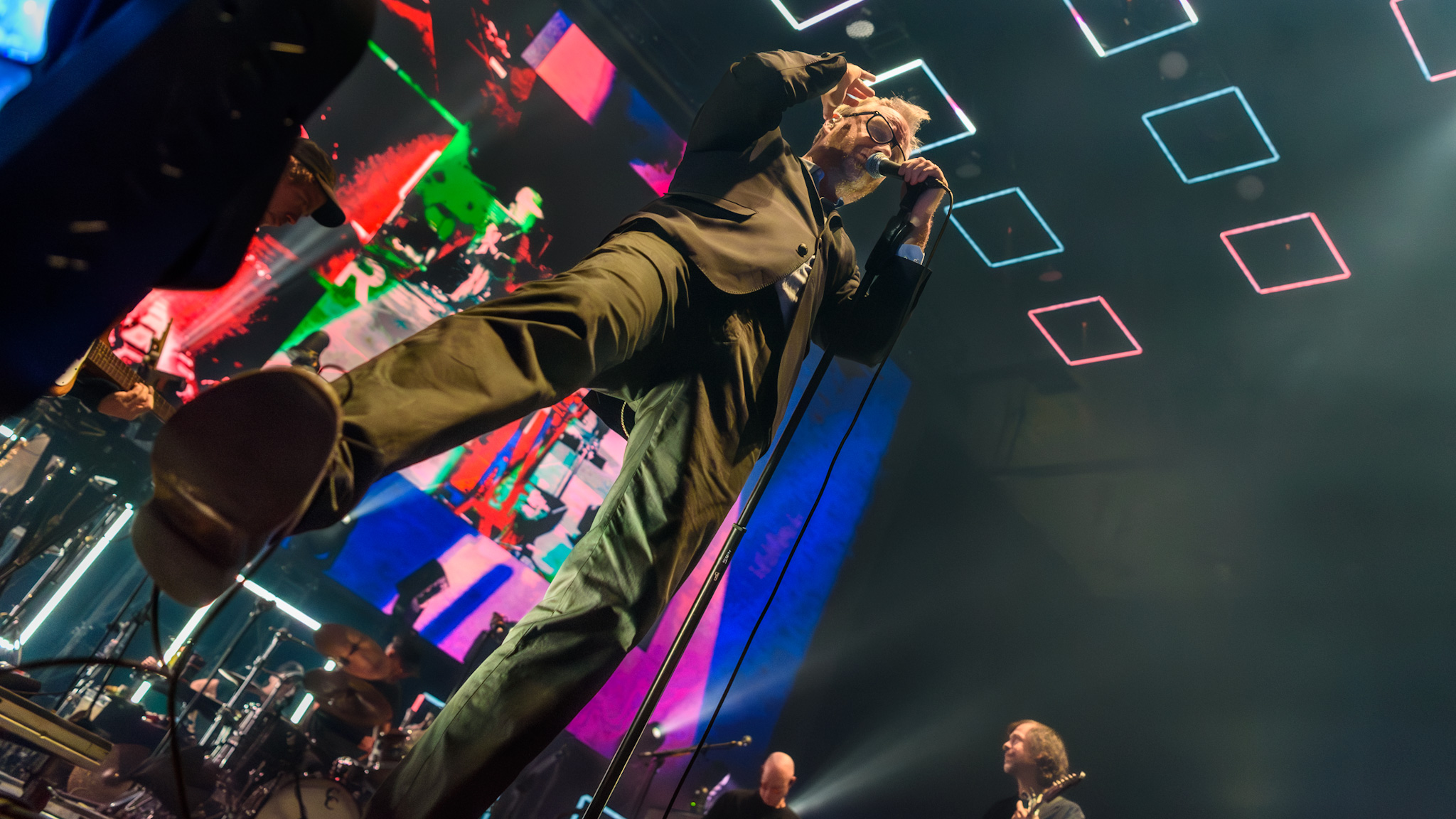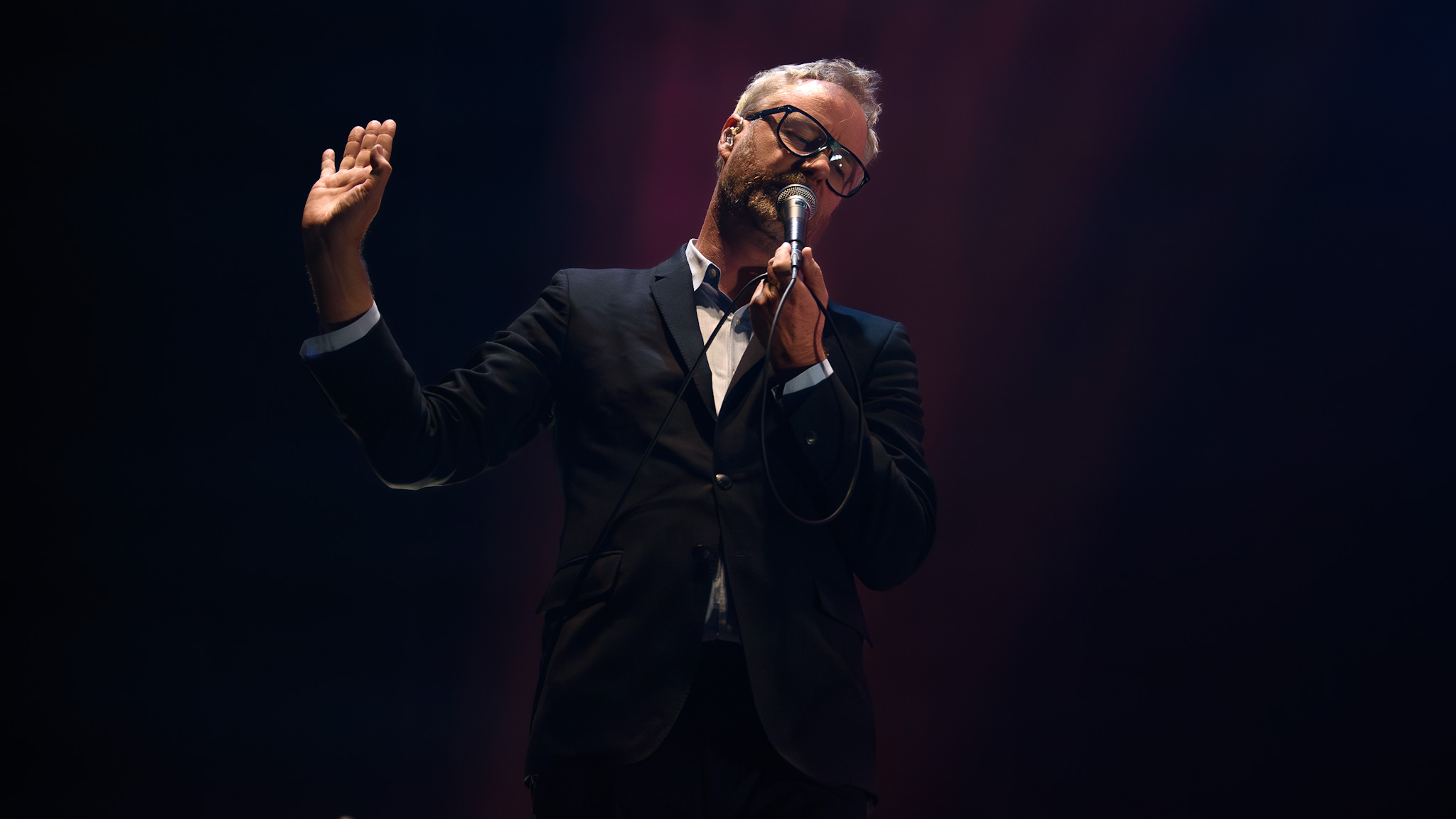 Im Hintergrund der spartanisch eingerichteten Bühne laufen derweil farblich harmonierende Videos und abstrakte Silhouetten. Am Bühnenrand stehen quadratische Lampen, die sich drehen und winden. An diesen hat Berninger einen Narren gefressen, so versucht er die Lichtkörper zu bändigen, Herr über sie zu werden, und sie nach seinem Willen zu bedienen. Als er sich auf einen der Scheinwerfer setzt, gibt der Motor nach und Matt Berninger plumpst hin. Er nimmt es sportlich, die Lampe nicht.