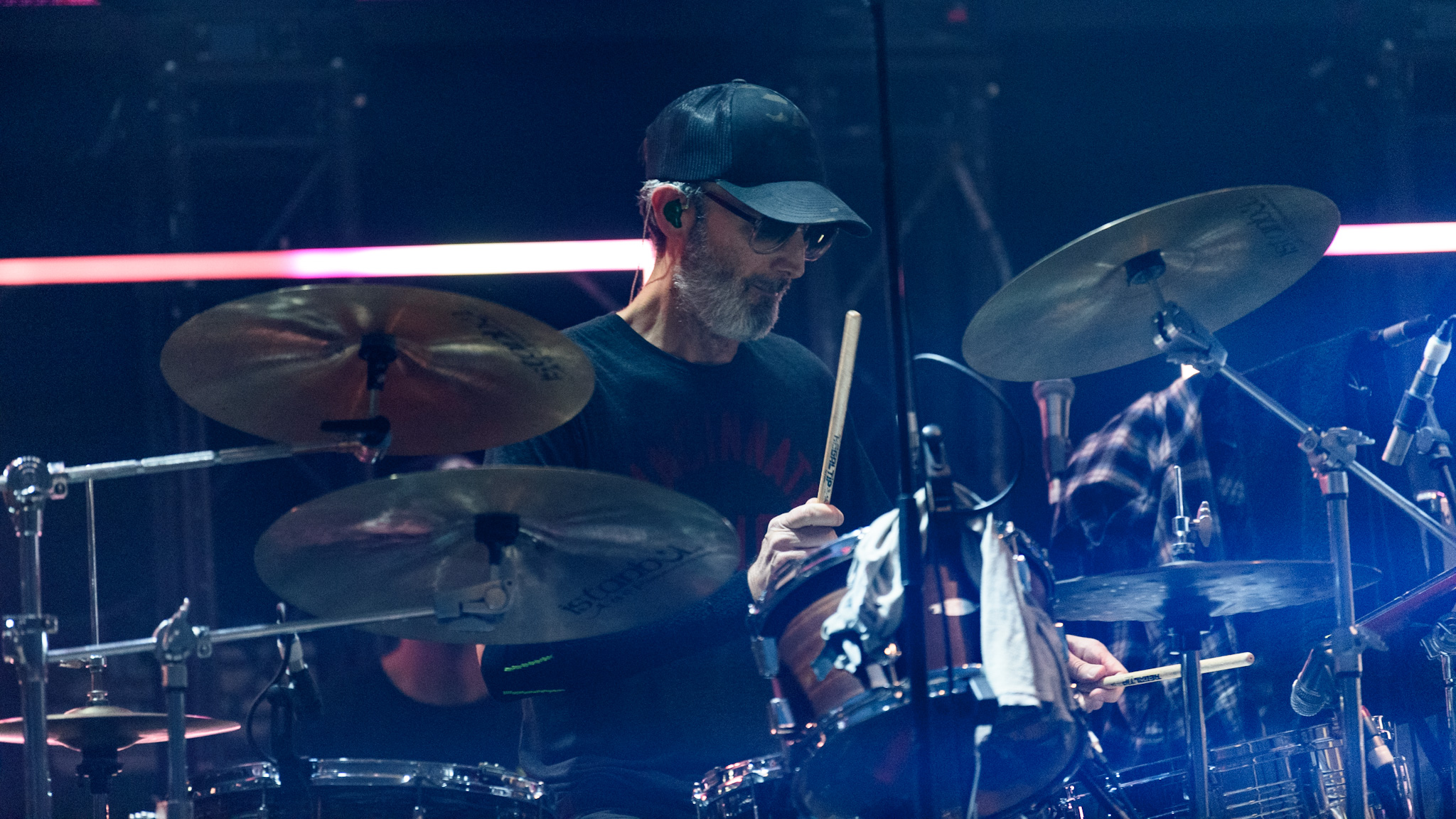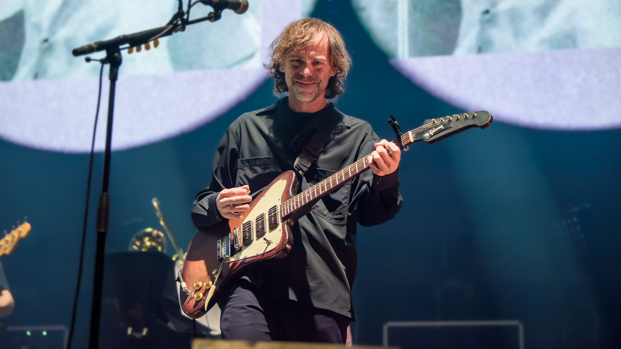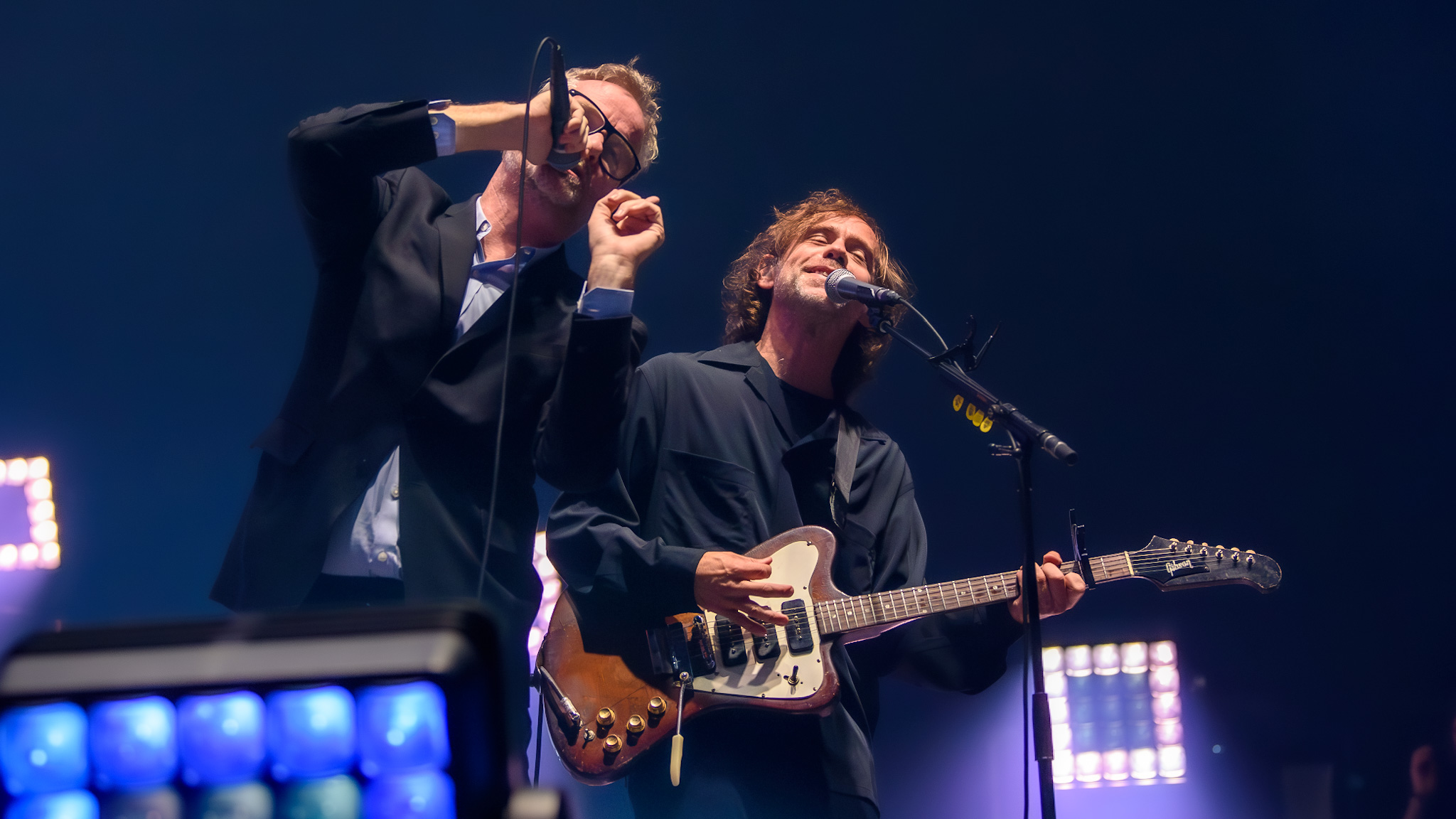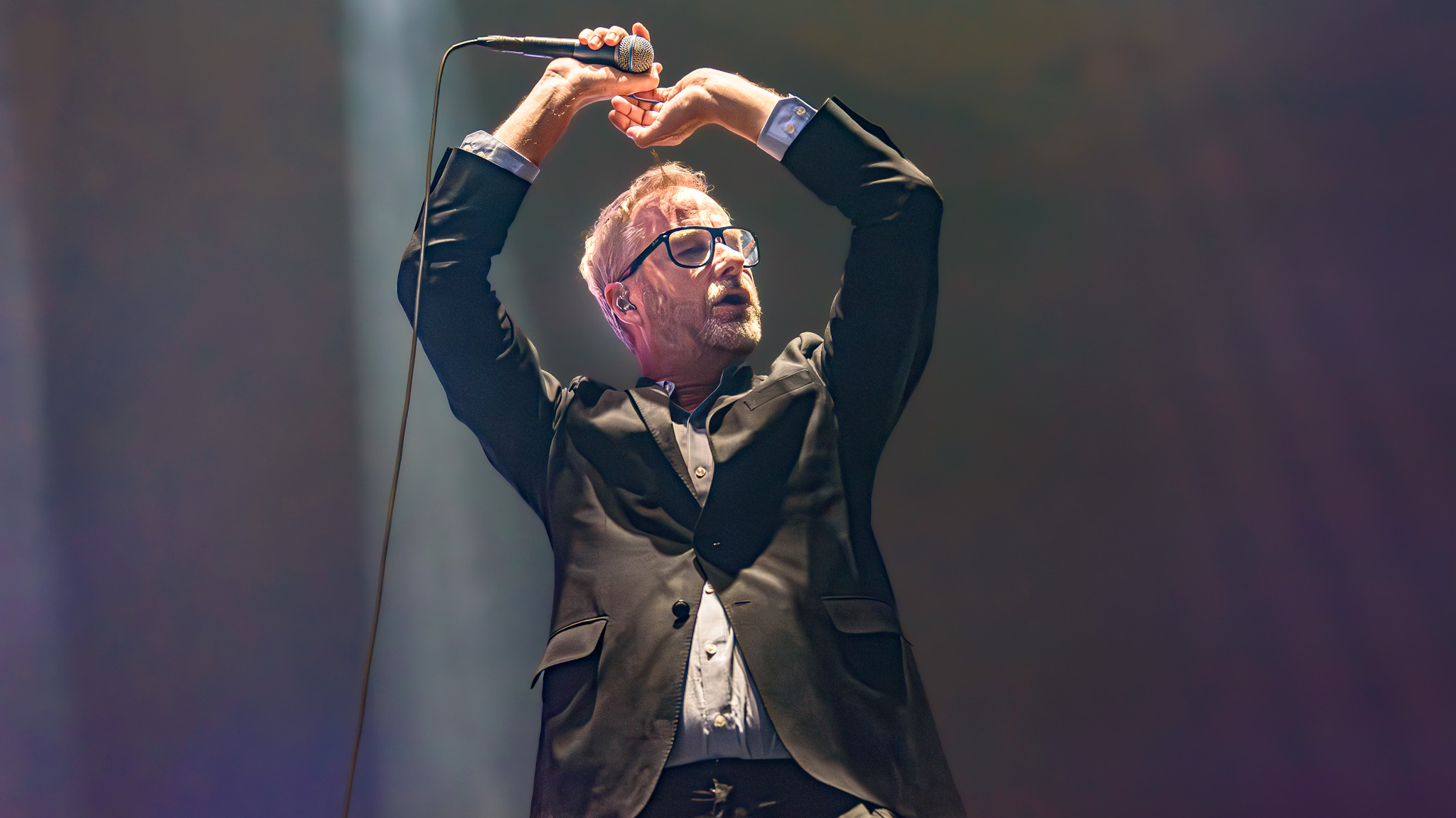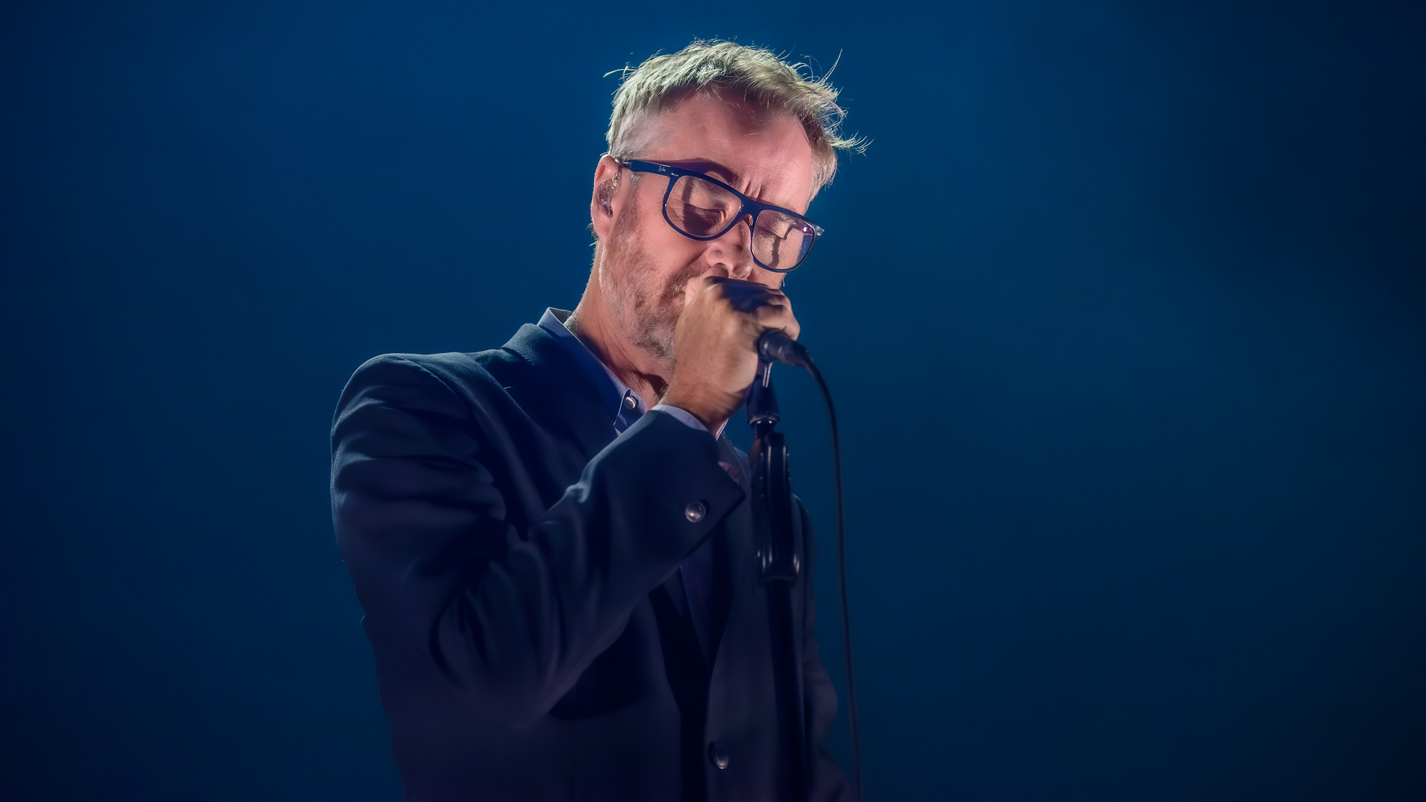 Im Hintergrund der spartanisch eingerichteten Bühne laufen derweil farblich harmonierende Videos und abstrakte Silhouetten. Am Bühnenrand stehen quadratische Lampen, die sich drehen und winden. An diesen hat Berninger einen Narren gefressen, so versucht er die Lichtkörper zu bändigen, Herr über sie zu werden, und sie nach seinem Willen zu bedienen. Als er sich auf einen der Scheinwerfer setzt, gibt der Motor nach und Matt Berninger plumpst hin. Er nimmt es sportlich, die Lampe nicht.