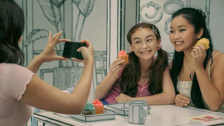Wenn Lara Jean mit ihren Schwestern Margot (Janel Parrish) und Kitty (Anna Cathcart) in einem Café sitzt, das aussieht wie eine gezeichnete Welt, ist das schon fast metaphorisch zu deuten. Auch wenn es das touristische Café in Seoul wirklich gibt, steht es sinnbildlich für die Atmosphäre aller drei Filme: alles perfekt, alles nur gezeichnet.